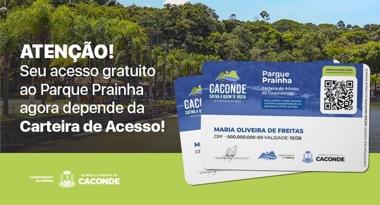 A Prefeitura da Estância Climática de Caconde informa sobre a nova Lei que regulamenta o acesso ao Parque Prainha. A partir de agora, para que os cacondenses desfrutem do acesso gratuito, é necessário a emissão da Carteira de Acesso. Em caso de não apresentação da carteira, haverá cobrança de ingresso, aos sábados, domingos, feriados, feriados prolongados e em dias determinados pelo Departamento de Turismo.